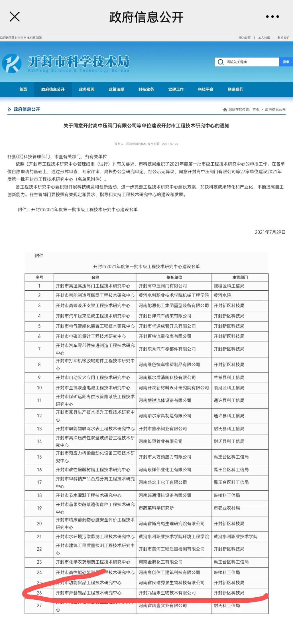 2021年7月29日,开封市科技局公布了《开封市2021年度第一批市级工程技术研究中心建设名单》,该通知中,由开封九福来生物技术有限公司学术研发带头人张荣轩教授领衔的“开封市芦荟制品工程技术研究中心”获批立项,接下来,将响应政府号召,积极开展科技研发和创新活动,加快科技成果转化和产业化,不断提高自主创新能力。